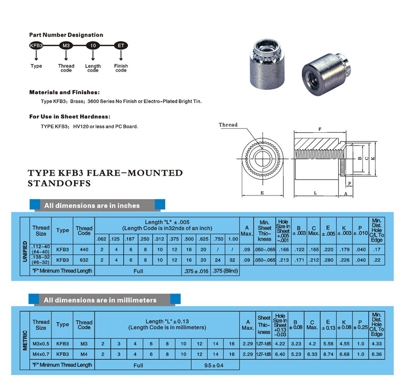 安装于P.C.板上时能使花齿与面板紧密连接;铆接时候向外展开能够承受更大的推拉力.螺纹规格:#4到#6和M3到M4.