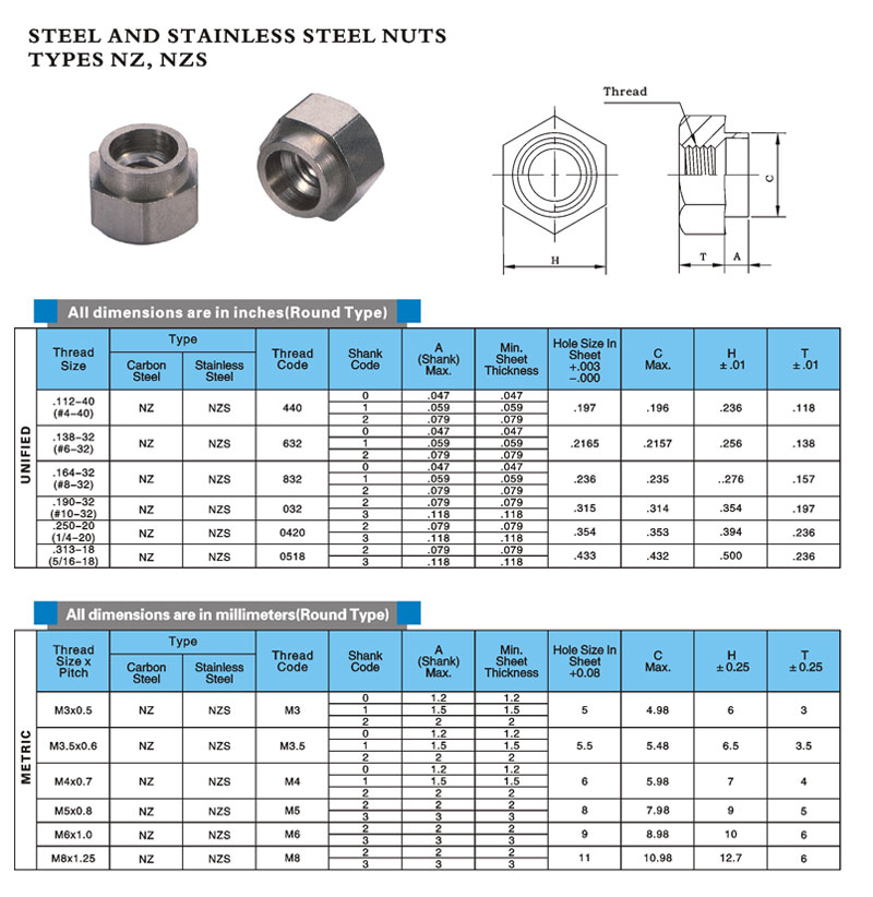 能采用一般标准工具快速方便的铆接,具有圆形和六角形两种,螺纹规格:#4到5/16"和M3到M8。
