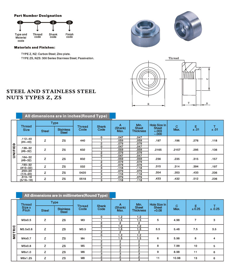 能采用一般标准工具快速方便的铆接,具有圆形和六角形两种,螺纹规格:#4到5/16"和M3到M8。