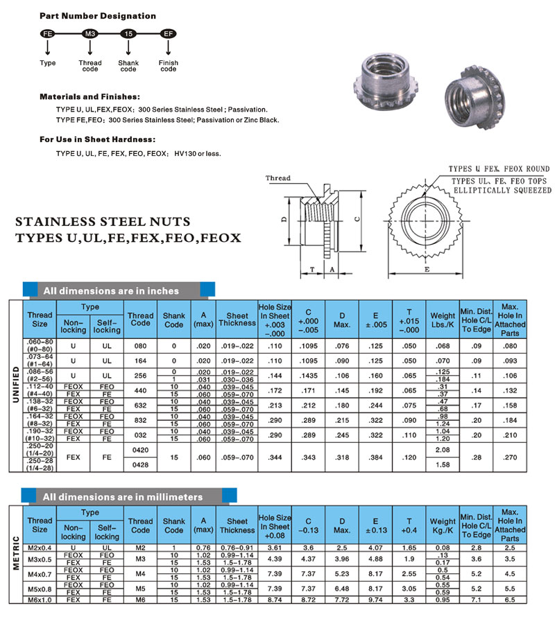 占微小的空间,有高强度的螺蚊,用于厚度0.2in/0.76mm以上的板材,分自锁与非自锁,螺蚊规格,#0到1/4"和M2到M6。