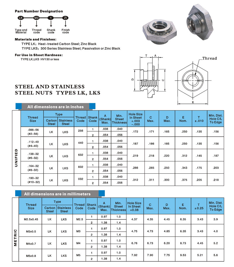 其性能卓越的自锁设计更加便于快速、简单有组装。通过从面板反面的铆装,能够确保表面平整,不突起同时能随很高的扭力(比一般的自锁扭力强很多倍),能有效防止脱落。螺纹规格:#2到#10和M2.5到M5。