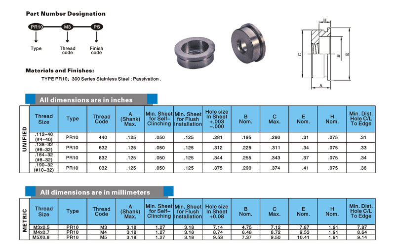 螺钉头部能埋入.125"/3.2mm的薄板;当拧松时,螺钉可以与铆套连在一起,不脱落;适用于硬度在HRB70或者以下的铆装板.螺纹规格:# 4到#10";M3到M5.