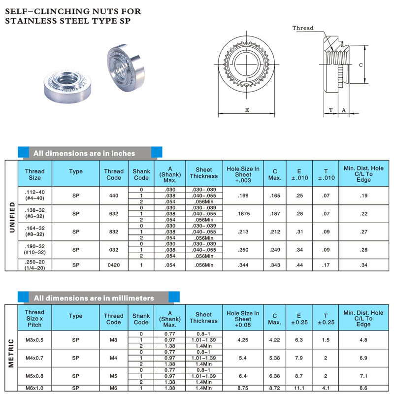 采用标准工具能快速、便捷的安装;具有良好的抗拉和抗扭性能;安装不易变形,背面能紧密的怀板面齐平。用于0.8mm以上的板材,螺纹规格:#2到1/2",M2到M10。